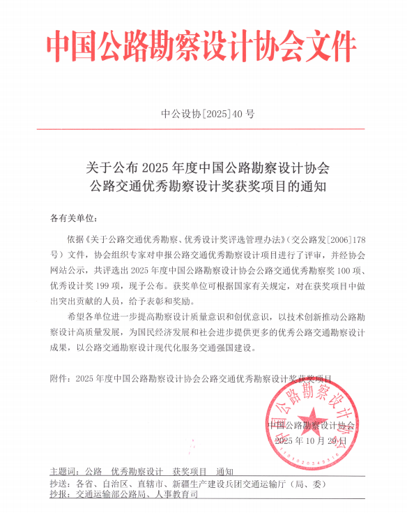 中科路恒工程设计公司荣获全国公路交通优秀勘察设计奖